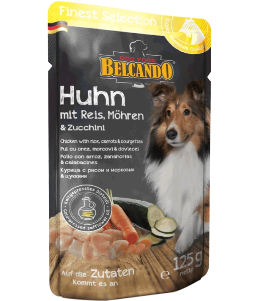 | Hühnerfleisch, -herz, -leber, -muskelmagen, -hals (63 %); Fleischbrühe vom Huhn (28 %); Reis (4 %); Karotten (2 %); Zucchini (2 %); Distelöl (0,5 %); Mineralstoffe (0,5 %) |