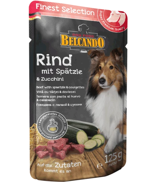 | Rinderfleisch, -herz, -lunge, -leber, -kehlkopf, -pansen (63 %); Fleischbrühe vom Rind (28 %); Spätzle (4 %); Zucchini (4 %); Distelöl (0,5 %); Mineralstoffe (0,5 %) |