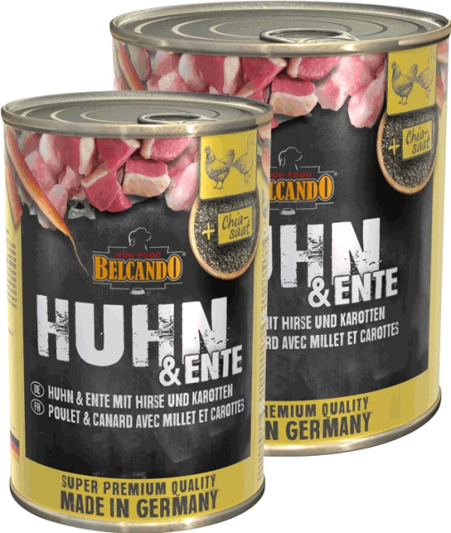 Hühnerfleisch, -herz, -leber, -muskelmagen (40 %); Entenfleisch, -herz (25 %); Fleischbrühe von Huhn, Ente (24,5 %); Hirse, gekocht (4 %); Karotten (4 %); Chiasaat (1 %); Mineralstoffe (1 %); Distelöl (0,5 %) |