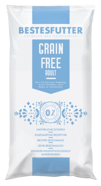 Bestesfutter Grainfree ist sehr chmackhaft und bekömmlich mit echtem Fleisch und vielen natürlichen Zutaten. Eine ausgewogene, nährstoffreiche Vollnahrung mit 5 tierischen Proteinquellen, um einer einseitigen Ernährung vorzubeugen. Bestesfutter Greinfree ist dabei auch für sensible Hunde geeignet. Dabei ist Bestesfutter nicht nur gluten- und getreidefrei, sondern auch frei von Rind, Schwein, Soja oder Weizen. Zudem mit Omega-3 Fettsäuren aus hochwertigem Lachs.
