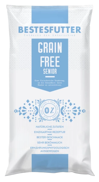 Bestes Futter Grainfree Senior Lite ist ein abwechslungsreiches, getreidefreies Hundefutter mit viel Fleisch, Gemüse und Obst für Senioren und Hunde mit reduziertem Energiebedarf. Hunde im Alter oder solche, die zu Übergewicht neigen, haben einen geringeren Grundumsatz und benötigen ein Futter, das Ihren speziellen Bedürfnisse angepasst ist. Der Bedarf an Vitaminen und Mineralstoffen ist hingegen gleichbleibend oder sogar erhöht. Unser Grain Free Senior/Lite ohne Kartoffel, Erbse, Bohne und Linse dafür aber mit Süßkartoffel und grüner Banane und zusätzlichen Ballaststoffen zur Unterstützung der Darmgesundheit.
