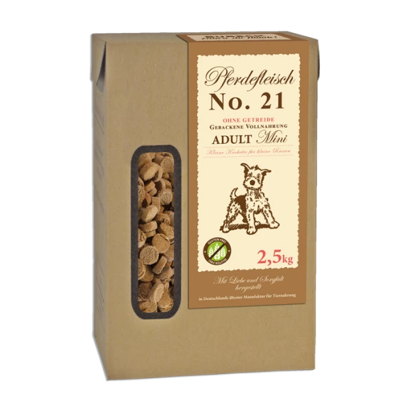 | 53% Pferdefleisch (50% Frischfleisch, 40% getrocknet und gemahlen, 10% Pferdeherzen, Pferdeleber und Pferdelunge), Kartoffelmehl, Kartoffelflocken, Amaranthmehl, Volleipulver, Rapsöl, Apfel (getrocknet und gemahlen), Petersilie, Karotten, Pastinaken, Liebstöckel, Rosmarin, Dicalciumphosphat. |