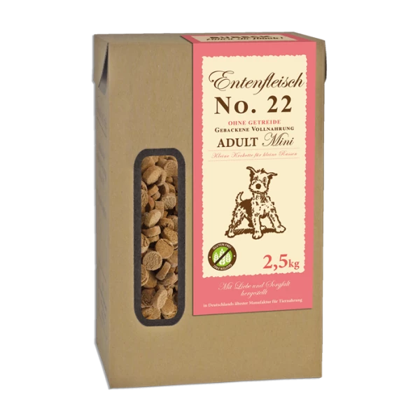 | 53% Entenfleisch (50% Frischfleisch, 40% getrocknet und gemahlen, 10% Entenherzen, Entenleber und Entenlunge), Kartoffelmehl, Kartoffelflocken, Amaranthmehl, Volleipulver, Rapsöl, Apfel (getrocknet und gemahlen), Petersilie, Karotten, Pastinaken, Liebstöckel, Rosmarin, Dicalciumphosphat. |