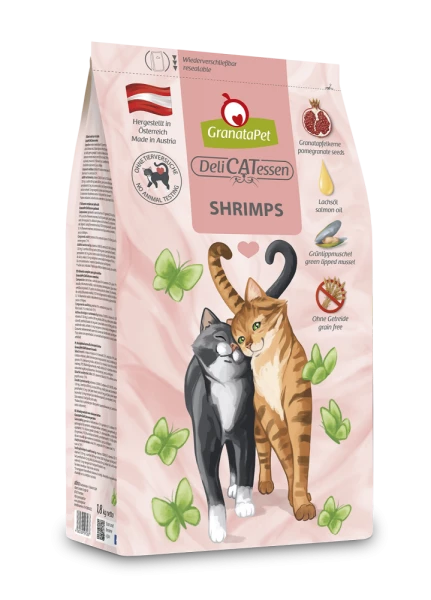 | Shrimps und Putenfleisch 42 % (Shrimps 23 %, Pute 19 %, getrocknet und fein vermahlen), Kartoffelflocken (aufgeschlossen), Geflügelfett, Granatapfelkerne 3 %, Cellulosepulver, Lachsöl 2 %, Mineralstoffe, Katzenminzeblätter (fein vermahlen), FOS (Fructooligosaccharide), neuseeländische Grünlippmuschel 0,1 % (fein vermahlen, von Natur aus reich an Glucosamin und Chondroitin), Yucca schidigera |