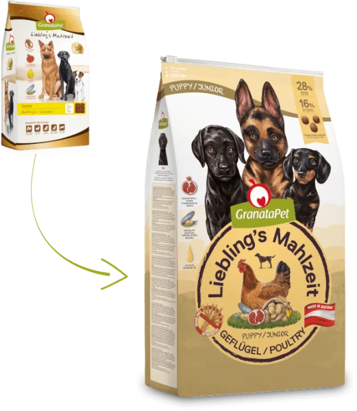 GranataPet Junior Liebling’s Mahlzeit Geflügel bietet eine schmackhaftes Hundefutter. Durch den hohen Anteil an hochwertigem Geflügelfleisch wird Ihr Hund optimal und orientiert an der Natur ernährt. So wird der junge und heranwachsende Organismus mit allem versorgt, was er benötigt.