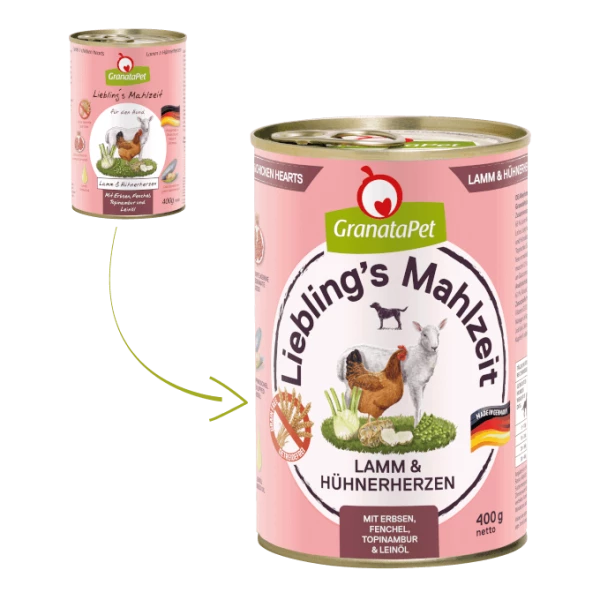 | Lammfleisch und Hühnerherzen 65 % (Lamm 45 % bestehend aus Muskelfleisch, Herz, Leber, Lunge und Hühnerherzen 20 % ), Lamm- und Hühnerbrühe 22,4 %, Erbsen 5 %, Fenchel 3 %, Topinambur 2 %, Granatapfelkerne 1 % (getrocknet und fein vermahlen), Mineralstoffe 1 %, Leinöl 0,5 %, Grünlippmuschel 0,1 % (fein vermahlen, von Natur aus reich an Glucosamin und Chondroitin) | |