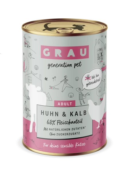 | 40% Huhn (Hühnerherzen, Hühnerfleisch, Hühnerleber, Hühnermägen, Hühnerhälse, Hühnerfett), 31% Brühe, 28% Kalb (Kalbsherzen, Kalbslungen), 1% Mineralstoffe |