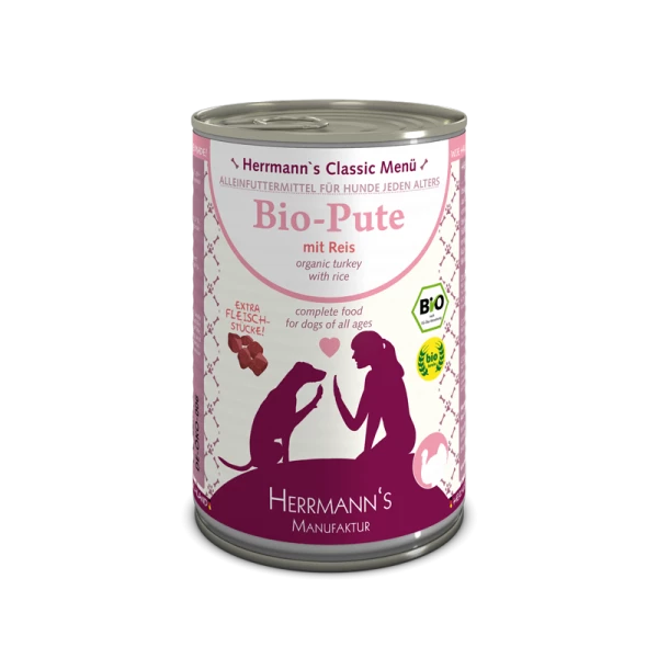 | 50% Pute (80 % Brustfleisch, 5 % Herzen, 5 % Hälse, 5 % Karkasse, 5 % Leber), Naturreis, Karotten, Sellerie, Fenchel, Nachtkerzensaat, ohne Zusatz- und Konservierungsstoffe und ohne Bindemittel |