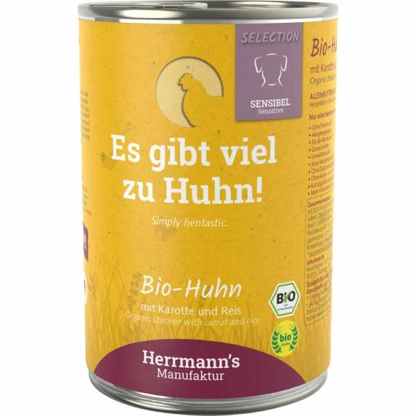 | 50% Bio Huhn (80% Brustfleisch, 5% Hälse, 5% Herzen, 5% Leber, 5% Karkasse), Bio Karotten 8%, Bio Reis 8%, Bio Petersilie, Bio Fenchel, Bio Nachtkerzenöl |