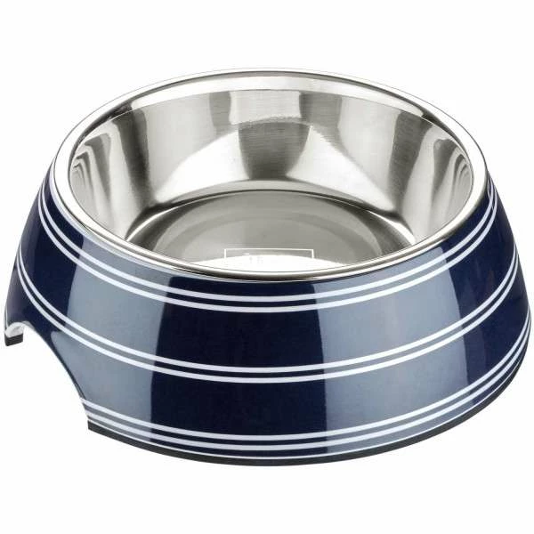 Der Melamin-Napf SILDA von Hunter überzeugt durch sein tolles Streifen-Design. Er ist kratz- und stoßfest sowie besonders pflegeleicht. Sehr praktisch ist der herausnehmbare Innennapf aus Edelstahl. Die Gummiaufsätze am Napfboden sorgen für einen sicheren Stand und verhindern ein Verrutschen des Napfes bei übermütigem Fress- oder Trinkverhalten. Er ist einfach zu reinigen. Einfach mit einem feuchten Tuch ausgewischt oder in der Spülmaschine reinigen.