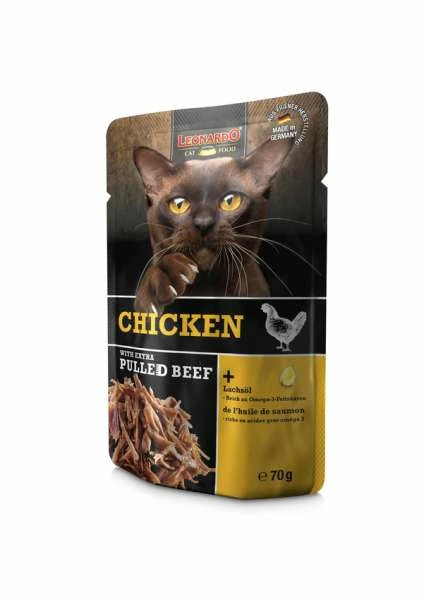 | Hühnerfleisch, -leber, -herz, -muskelmagen (40 %); Fleischbrühe (33,8 %); Rindfleisch, gezupft (14 %); Rinderlunge (11 %); Eierschalen, getrocknet (0,5 %); Mineralstoffe (0,5 %); Lachsöl (0,2 %) |