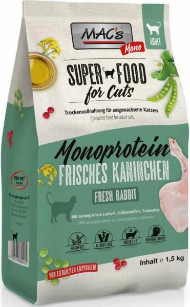 MAC’s Mono Kaninchen besteht ausschließlich aus Kaninchen und Erbsen, als Protein- und Kohlenhydratquelle. Mac´s Mono eignet sich ideal bei empfindlichen Katzen und ist zur Ausschlussdiät geeignet. Die getreidefreie Vollnahrung wurde entwickelt, um das Wohlbefinden Ihres Lieblings zu steigern. Das Norwegische Lachsöl ist reich an Omega-Fettsäuren und sorgt so für ein glänzendes Fell. Cranberries sind natürliche Säurebildner und können bakteriellen Blaseninfektionen vorbeugen. Durch schonende Zubereitung und die Zugabe von Vitaminen und Mineralstoffen wird eine naturnahe Ernährung Ihrer Katze erreicht