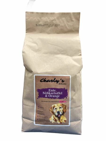charlys delicate lecker Hundefutter mit delikater Ente, Süßkartoffel und Orange ist ein spezielles getreidefreies Hundefutter (Alleinfuttermittel) mit einem hohen Fleischanteil. Single-Protein Ente.